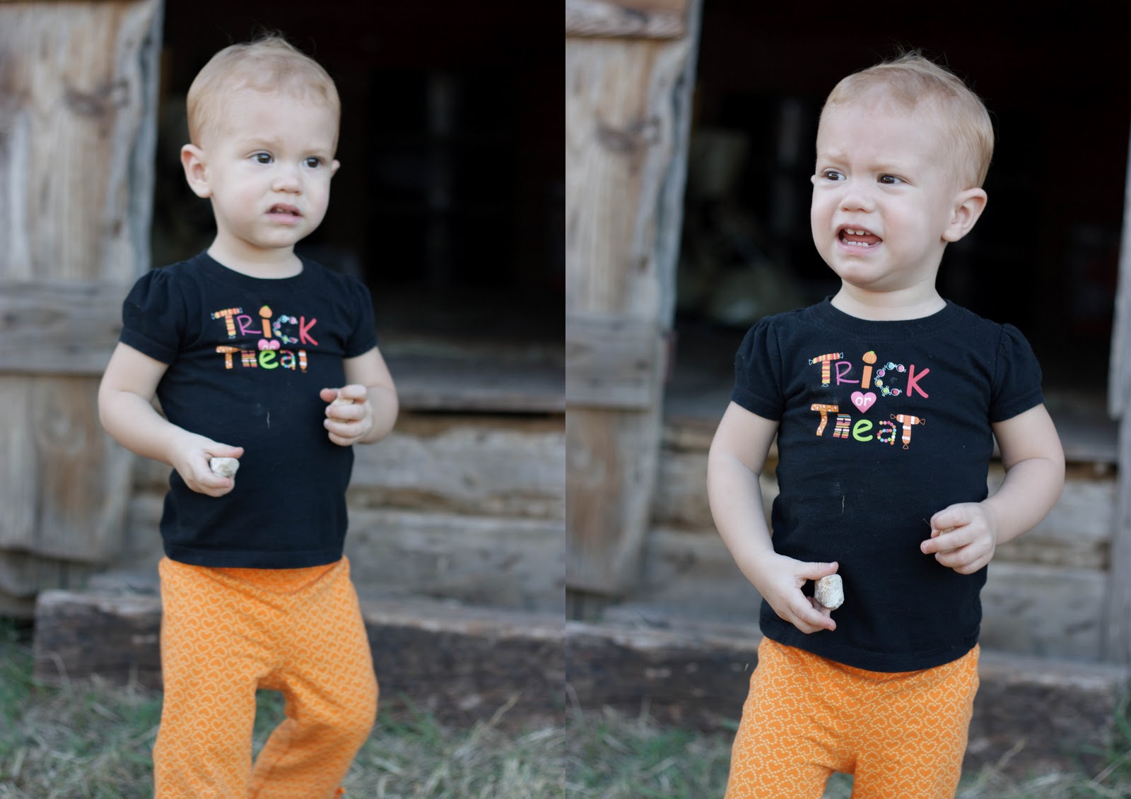 Trying to pick up and move her pumpkin. It's pretty heavy. She managed to move it a few feet, though. She is a very determined little girl.